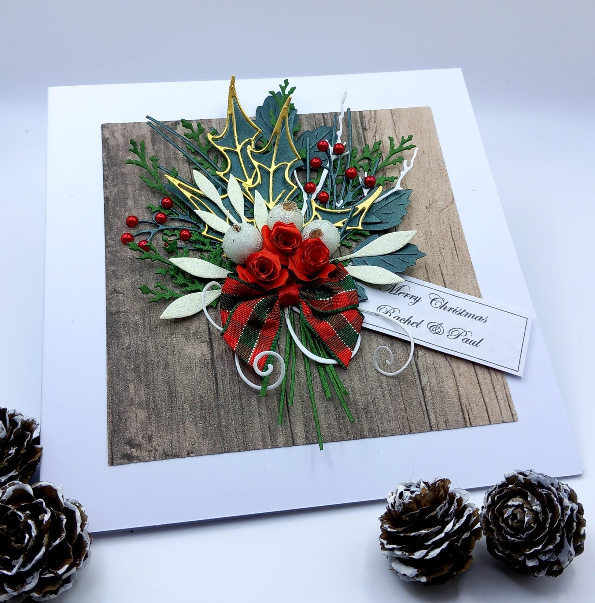 Handmade Luxury Christmas Card * Personalised * 3D * Boxed * Rustic Style * Christmas bouquet with tartan bow.