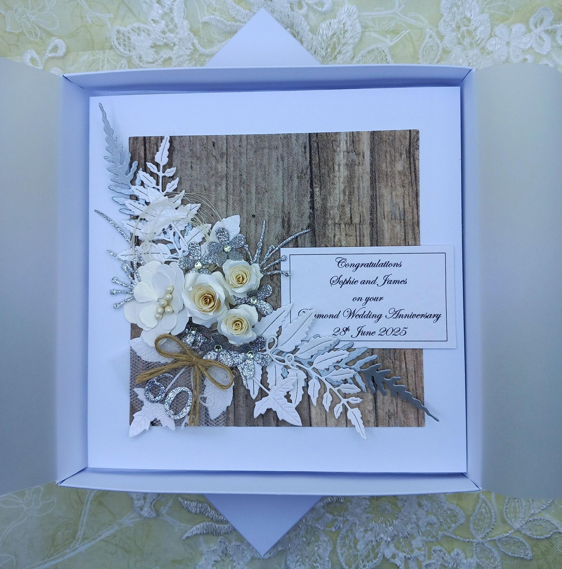 Unique, handmade Diamond Wedding Anniversary, 60th, card * 3D * Boxed * Personalised * Rustic style * Luxury