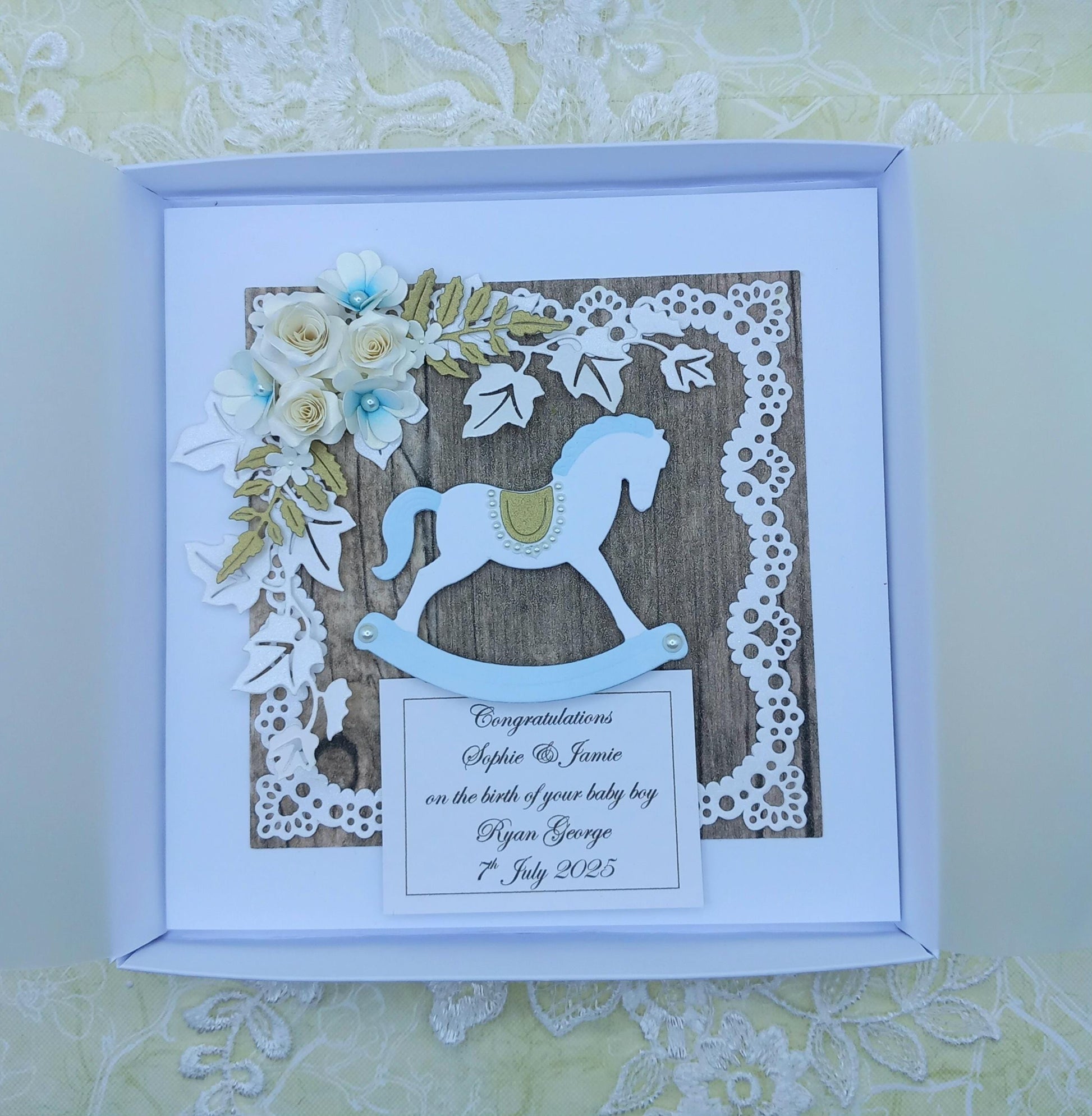 Unique, Handmade New / Birth of Baby Boy Card * 3D * Personalised * Boxed * Rustic Style * Luxury
