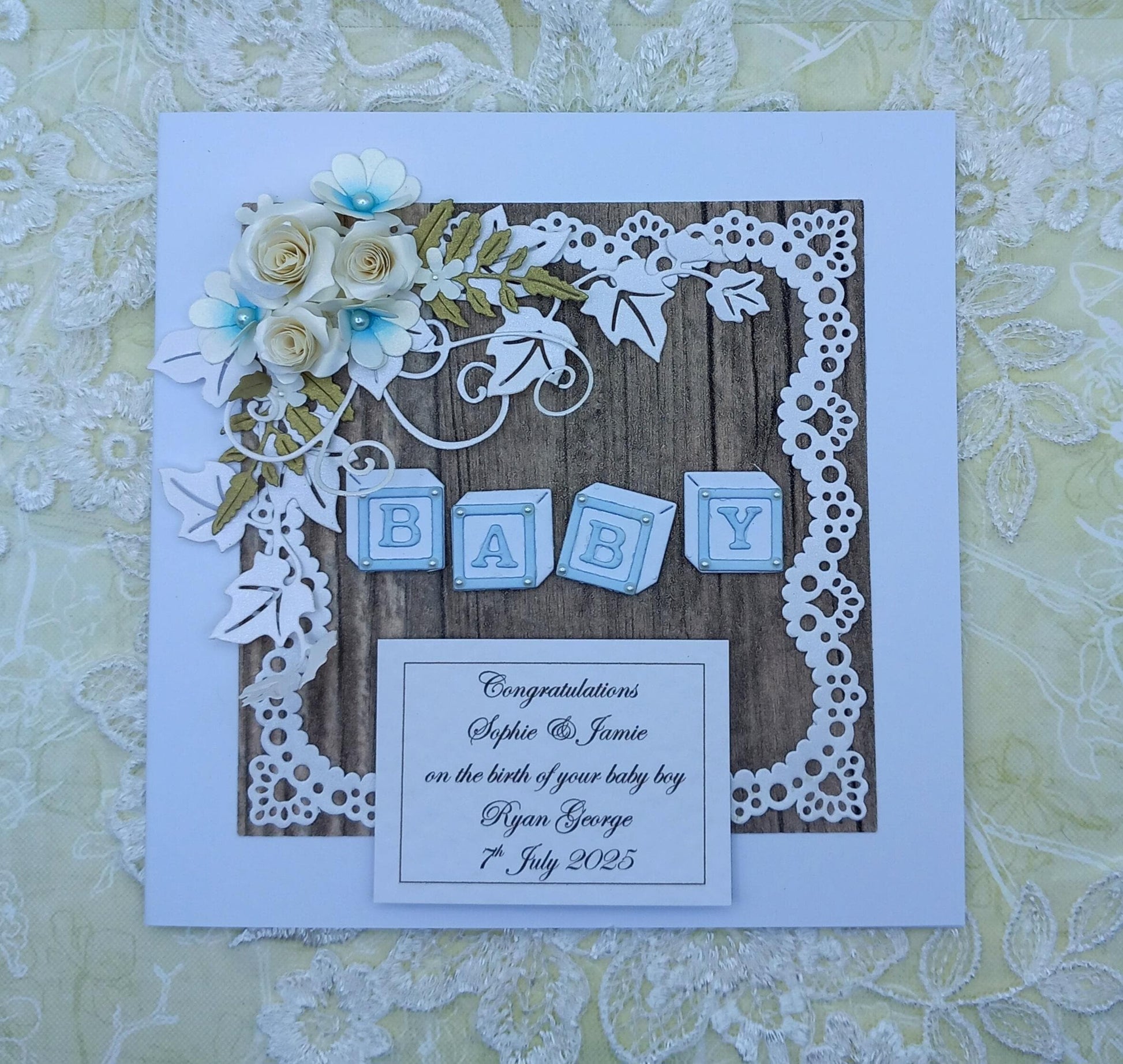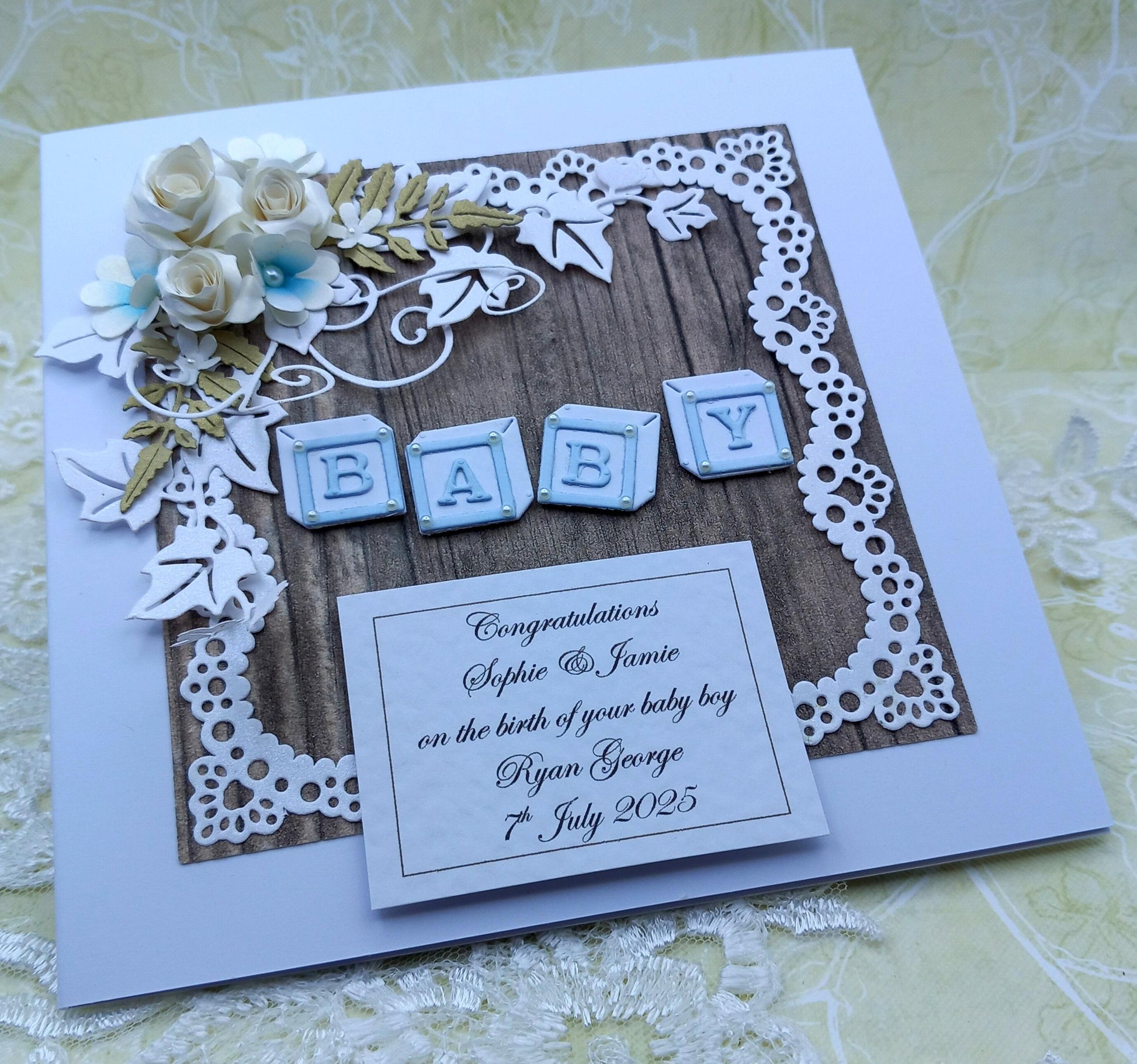 Unique, Handmade, New / Birth of Baby Boy Card * 3D * Personalised * Boxed * Rustic Style * Luxury