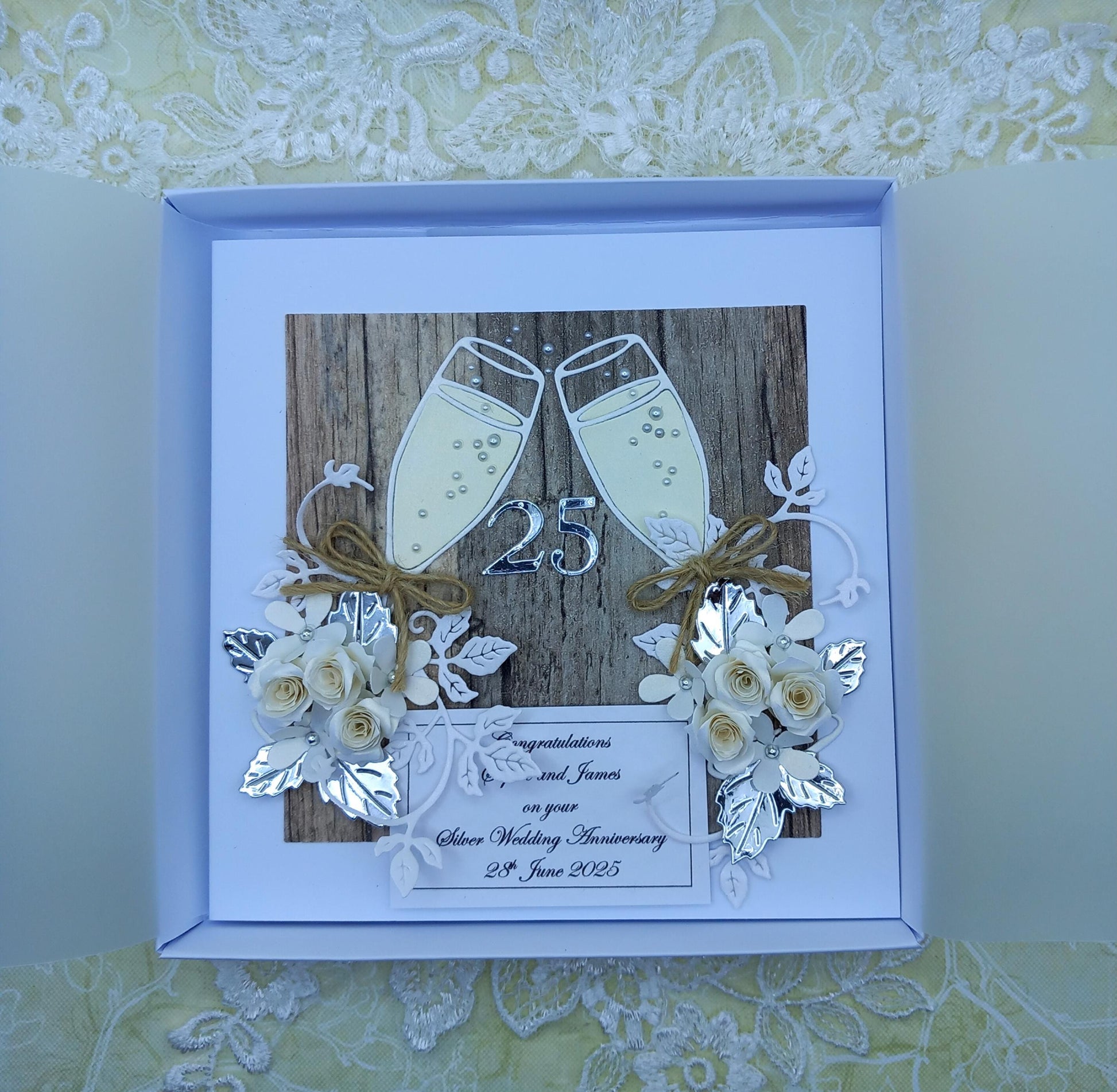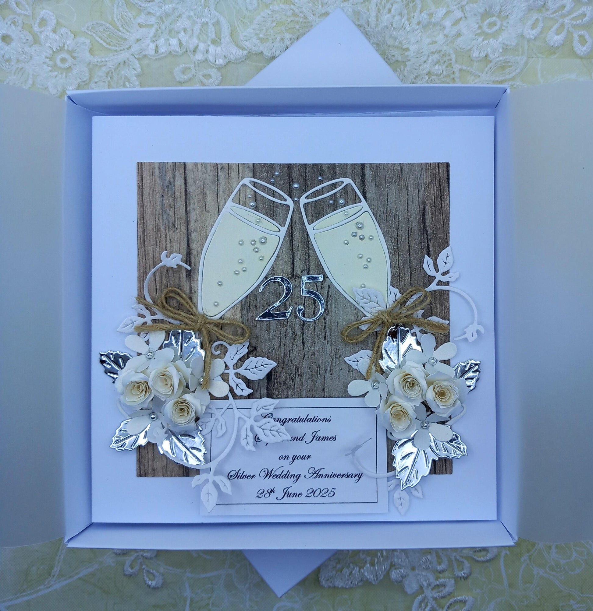 Unique, Handmade Silver Wedding [ 25th ] Anniversary Card * 3D * Personalised * Boxed * Rustic Style * Luxury
